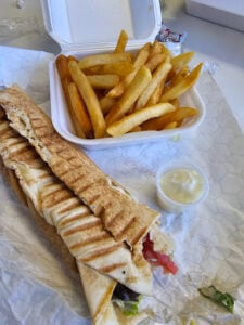 Notes: The sandwich must be reduced in size or wrapped correctly to become shawarma