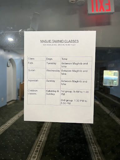 Masjid Tawhid is a Sunni mosque located in Brooklyn, New York. It serves the community by conducting five daily prayers and Jumu'ah prayers.